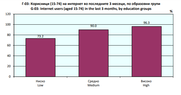 По образование, корисниците (15-74 години) не го користат подеднакво интернетот. Односно, 96.3% од лицата со високо образование користеле интернет во првите три месеци од 2021 година наспроти 90% со средно образование и 73.2% со ниско образование.