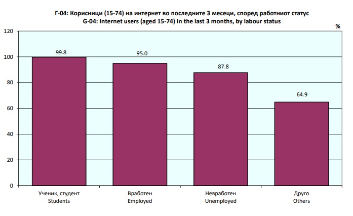 Особено интересни се податоците за користење на интернетот според работниот статус на корисниците. Младите генерации водат убедливо, каде 99.8% од учениците и студентите користеле интернет во првите три месеци на 2021 година, наспроти 95% од вработените лица, 87.8% од невработените лица и 64.9% од други лица.
