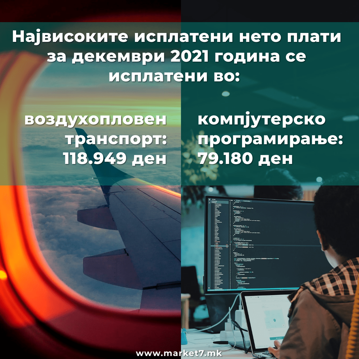 Највисока исплатена нето плата за декември 2021 година имаат вработените во воздухопловниот транспорт со 118.949 денари, а на второ место се програмерите со 79.180 денари.