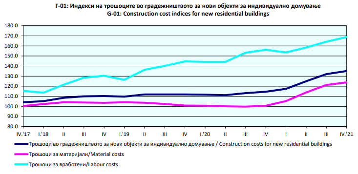 Во четвртиот квартал од 2021 година, во споредба со третиот квартал од 2021 година, трошоците во градежништвото за нови објекти за индивидуално домување се повисоки за 2.3 %, трошоците за материјали за 2.1 %, а трошоците за вработените за 2.8 %.