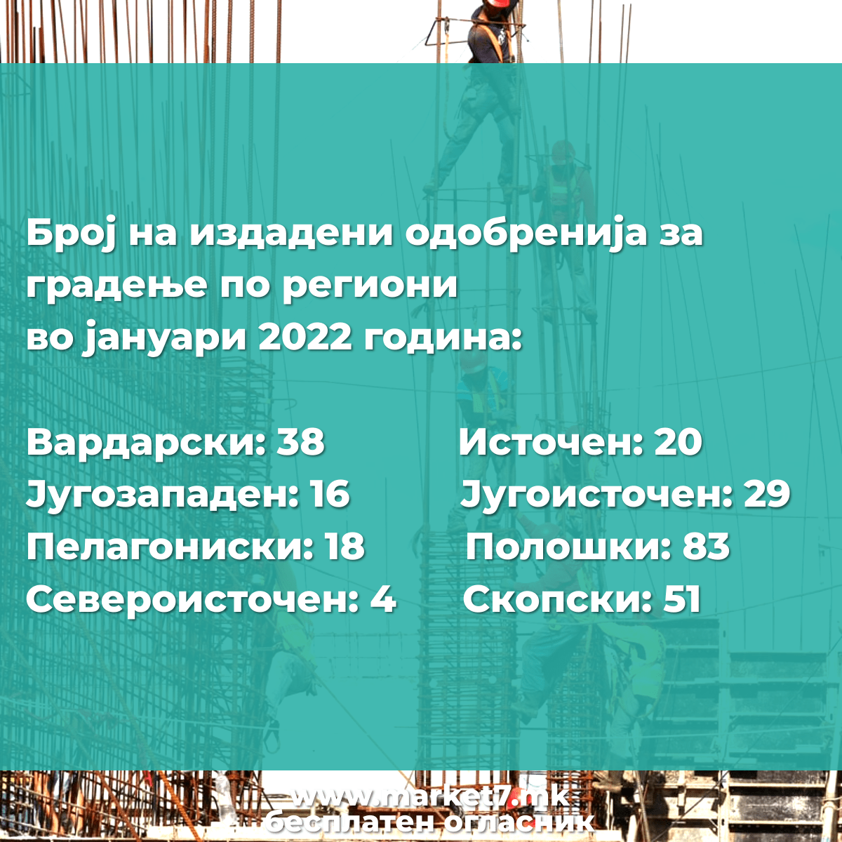 Во јануари 2022 година се издадени 259 одобренија за градење, што е за 30.2 % повеќе во однос на истиот месец од претходната година, објави Државниот завод за статистика.