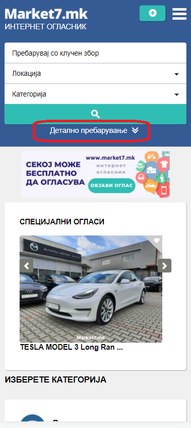 Всушност многу е лесно. Без разлика дали прегледувате огласи преку компјутер или мобилен телефон, постапката е иста, а постои мала разлика само во изгледот на функциите со цел прегледот на мобилен екран да изгледа полесно и поедноставно за употреба. Пребарувањето на Market7 огласник е замислено да нуди повеќестепено ниво на пребарување. Секогаш кога ќе ја отворите почетната страна (Дома) веднаш ви се видливи централните можности за пребарување по Клучен збор, Локација и Категорија, а под нив е полето „Детално пребарување“.